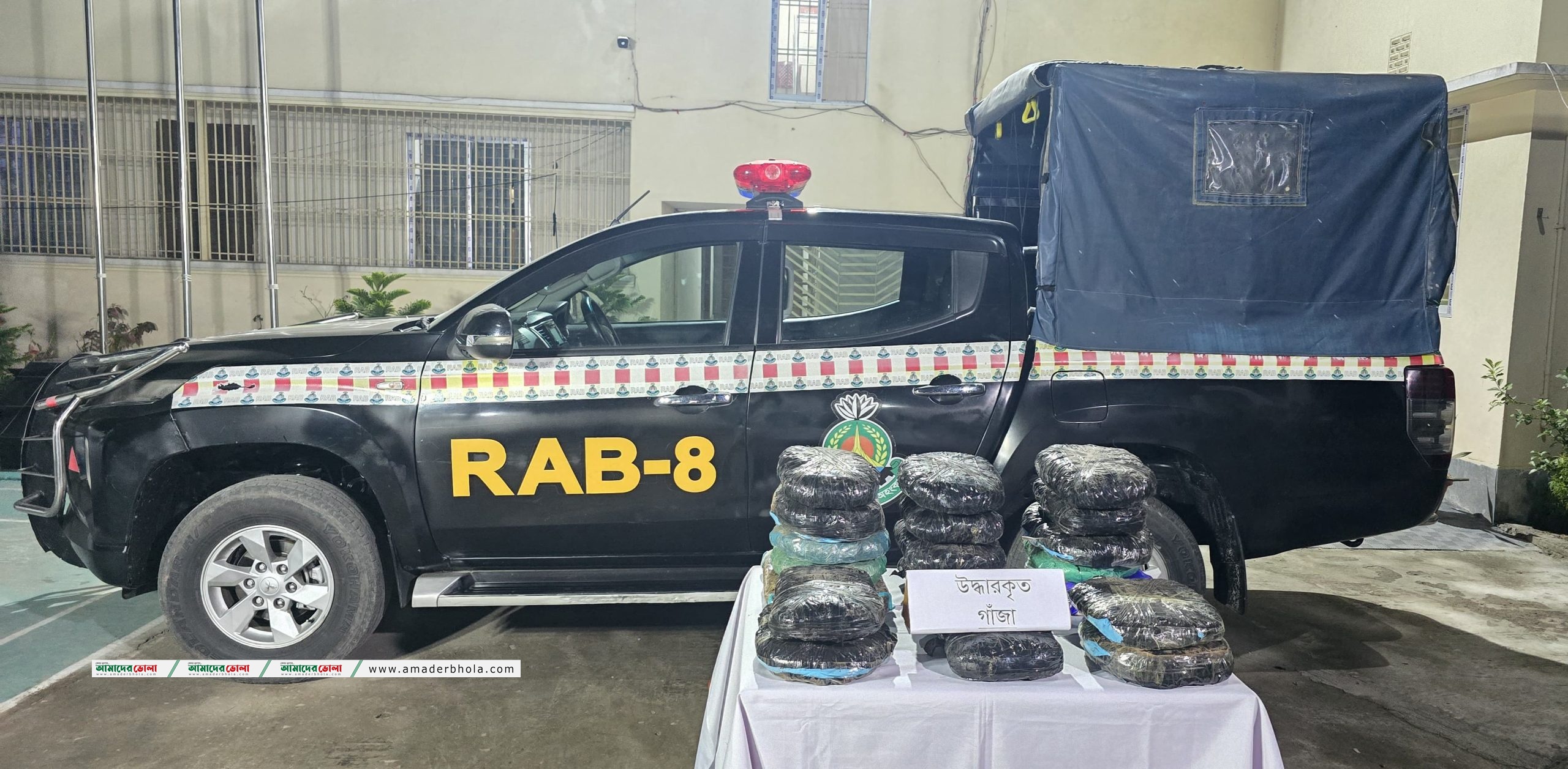 এরই ধারাবাহিকতায় অদ্য ০৮ ফ্রেব্রুয়ারি ২০২৬ ইং তারিখ ১৬.৩০ ঘটিকায় র্যাব-৮ বরিশাল এর অধীন ভোলা ক্যাম্প এর একটি আভিযানিক দল গোপন সংবাদের ভিত্তিতে ভোলা জেলার ভোলা সদর থানাধীন ভেদুরিয়া ফেরিঘাটস্থ ইকবাল স্টোরের সামনে চেক পোস্ট পরিচালনা করে একটি পিক আপ ও আসামী ১। মোঃ মনু মিয়া (৫৮), পিতা- মৃতঃ সোনা মিয়া, গ্রামঃ বিডিশ^র, থানা- দাউদকান্দি, জেলা- কুমিল্লা ২। মোঃ আসলাম (৫২), পিতাঃ মৃতঃ মোঃ শাহাজাহান, সাং কাছিপাড়া, থানা- বাউফল, জেলাঃ- পটুয়াখালীকে ১৯ কেজি গাঁজাসহ গ্রেফতার করে। আসামীদের বিরুদ্ধে ভোলা সদর থানায় মাদক দ্রব্য আইনে নিয়মিত মামলা রুজু করা হয়েছে।