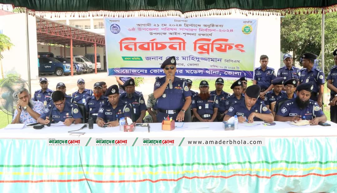২০ মে ২০২৪ খ্রিঃ তারিখে ভোলা সদর, দৌলতখান ও বোরহানউদ্দিন থানায় আগামী ২১ মে ২০২৪ খ্রিস্টাব্দে অনুষ্ঠিতব্য ৬ষ্ঠ উপজেলা পরিষদ সাধারণ নির্বাচন -২০২৪ উপলক্ষে আইন-শৃঙ্খলা রক্ষার্থে নির্বাচনী ব্রিফিং অনুষ্ঠিত হয়। উক্ত অনুষ্ঠানে প্রধান অতিথি হিসেবে উপস্থিত ছিলেন ভোলা পুলিশ সুপার মোঃ মাহিদুজ্জামান বিপিএম মহোদয়।